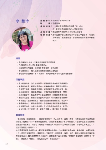 • 擔任導師 20 餘年,主動接受需要安置的特殊生 教職工作,能不斷進步、嘗試適切的教學法,讓能力優的學生得到更多啟發,也讓缺乏學習興趣的學