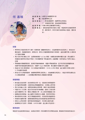 桃園市教師會組織發展部主任、桃園市 Super 教師評審、國立體育大學師培中心講師 保持「勇於任事、樂於分享」是我的信念;循著「欲福澤眾人,先豐富知能」成長脈絡,激勵把握學