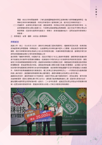 • 員山國中導師、總務主任 習才能讓生活知識與科學理論知識聯結。感謝臺師大科教所的全方位指導與各界提供教育資源,讓我
