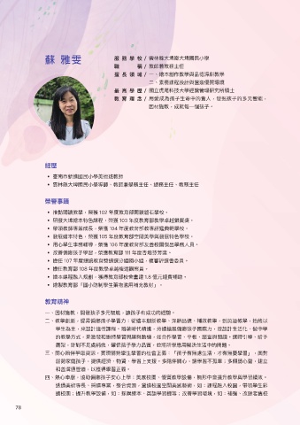 職 稱 / 教師兼教務主任 五、持續教育愛與帶領社群精進自我,化作孩子生命中的貴人。