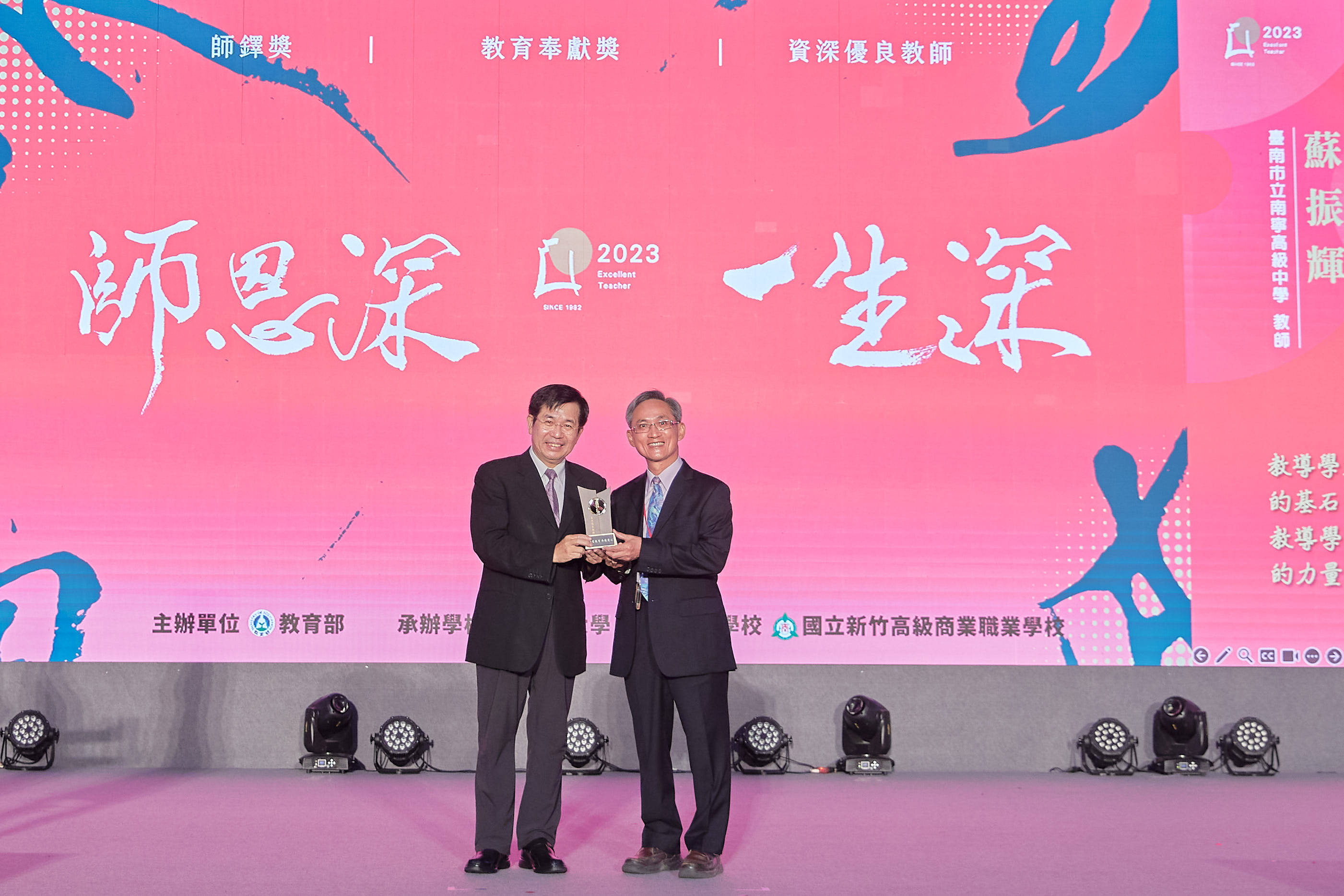 蘇振輝先生臺南市人,民國72年畢業於國立臺灣師範大學社會教育學系(英語輔系),分發至臺南縣立大灣國民中學(現臺南市立大灣高級中學),為創校首屆英語教師,先後兼任導師及訓育組長。民國80年介聘回母校臺南市立南寧國民中學任職。民國92年學校增設高中部,升格為完全中學。民國95年至97年擔任教務主任,任內學校新建圖書館,除發動家族捐款百萬,完備「蘇作紀念圖書室」(位於學校圖書館2樓、以捐贈設備者命名),並偕圖書館黃婉貞主任三訪「普洱世家」董事長曾國寶先生,獲慨捐國寶閱覽室(位於學校圖書館1樓)全部桌椅設備,總值166萬餘元。民國96年創辦首屆臺南市市長盃國中數學競賽,廣受重視,延續迄今。蘇老師為推廣品德教育,申請張榮發基金會發行之《道德月刊》,自民國97年創刊起,全校師生人手一冊,共讀實踐,潛移默化,頗收實效。以對母校之回饋與對教育之熱忱,蘇老師於民國79年獲選為第二屆南寧傑出校友;民國97年獲頒南寧鐸聲獎;民國98年榮獲臺南市優良教師師鐸獎。
