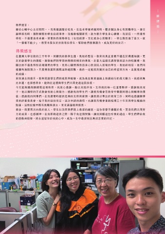 • 2024臺灣大學校內傑出服務獎 力的成果。也感謝神,在我即將退休之際,賜予我這個契機,讓我回顧這些珍貴的過往。學生們帶給我