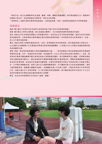 性;培養學生終身學習的生活態度,為社會的真善 成長經驗背景,在教學場域互動中激發出更多的創見與教學相長,有幸能陪伴學生的青春歲月,走過一