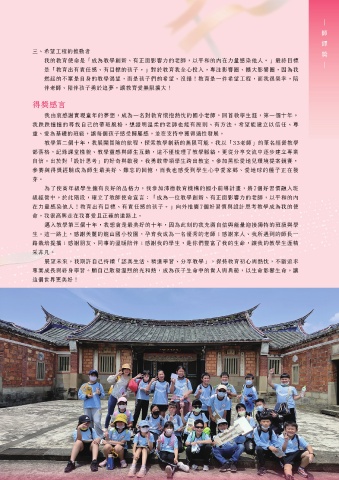 • 心三美德‧築班風:品格班級實踐閱讀美感且紀錄片摘優等佳績 路栽培提攜;感謝朋友、同事的溫暖陪伴;感謝我的學生,是你們豐富了我的生命,讓我的教學生涯精