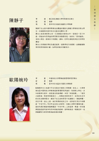 宋珍櫻女士畢業於國立臺灣教育學院科學教育系物理組,畢業後即 陳靜子女士臺中師專畢業後在職進修獲彰化師範大學特教系碩士學